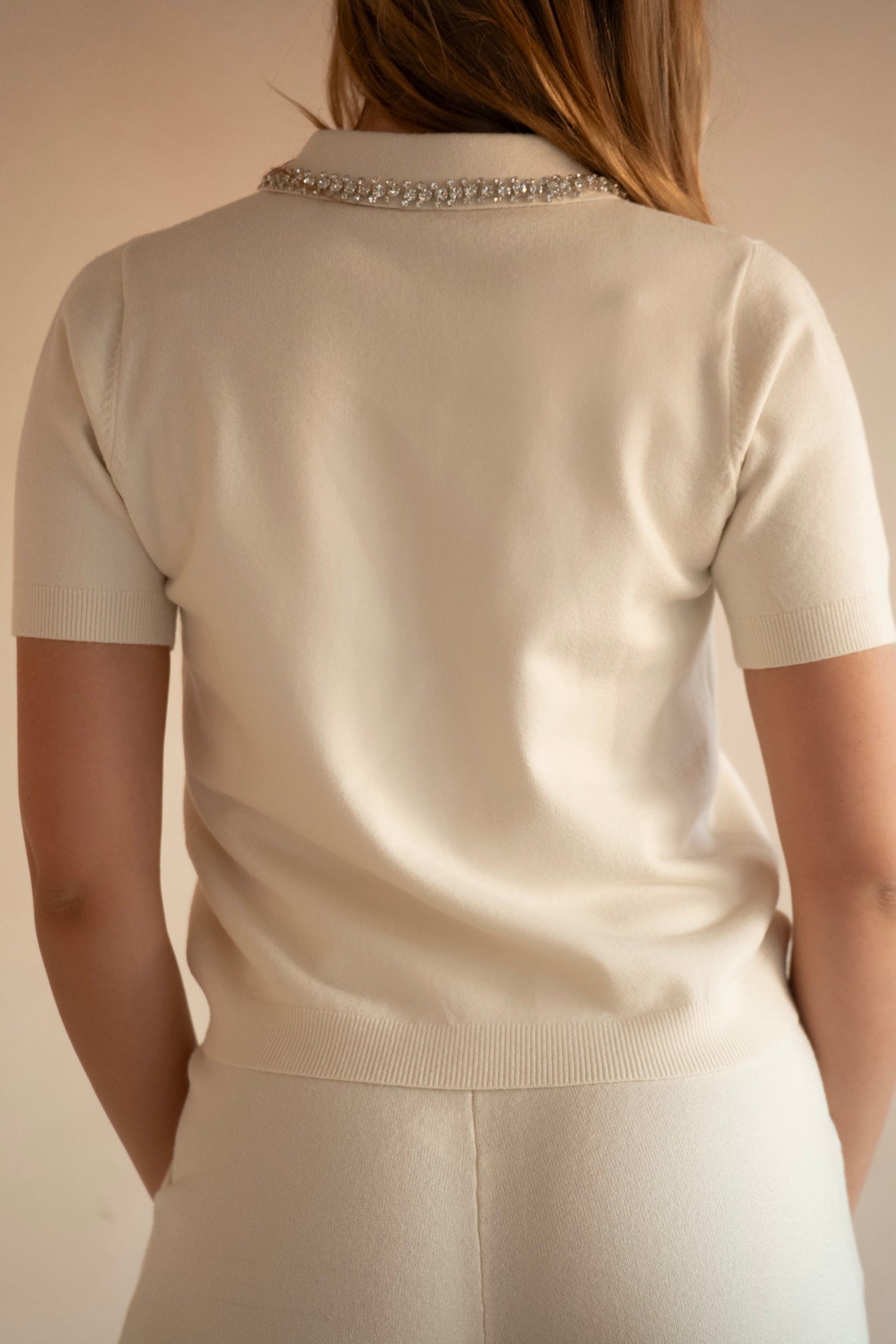 Puloverul moale din tricot are un guler împodobit cu diamante aplicate și nasturi cu bijuterii , detalii care luminează imediat aspectul și îl fac sofisticat și feminin.
